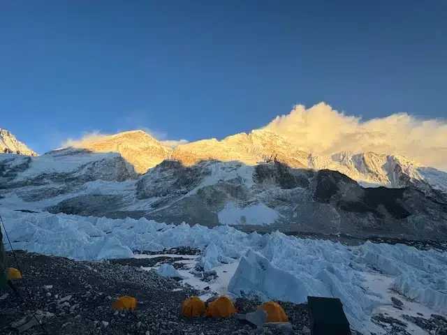 We woke up early, stepped outside, and saw the sunrise rising above the mountains—over Everest itself.